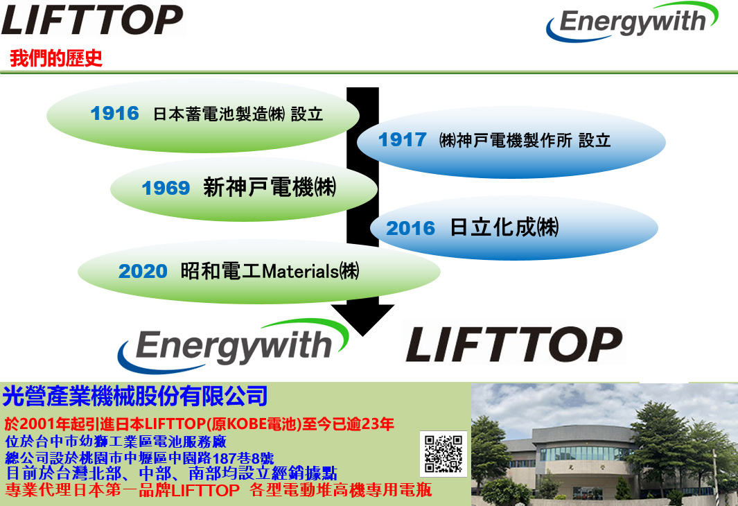 台灣第一家引進 電池,在2020年10月1日起 已經成功整合 電動堆高機電池,成為日本第一品牌最專業電池廠,也是目前唯一100%日本原廠製造